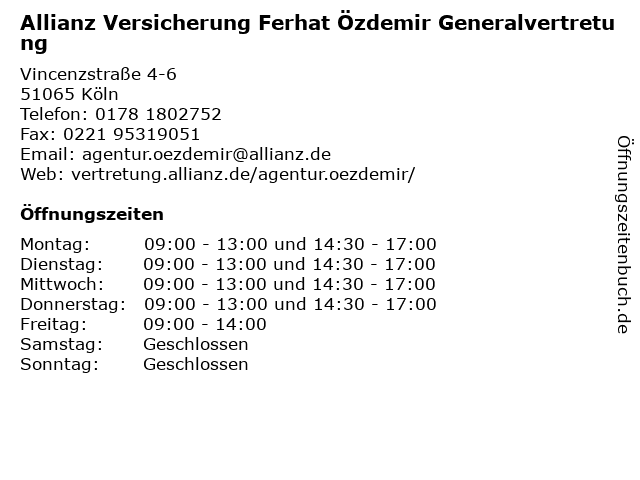 2 Allianz Versicherung Sedat Özdemir Generalvertretung (Entfernung: 0,64 km) Montanusstraße 113, 51065 Köln 5 Allianz Versicherung Rowaid Ido Hauptvertretung (Entfernung: 1,96 km) Berliner Straße 118, 51063 Köln 6 |