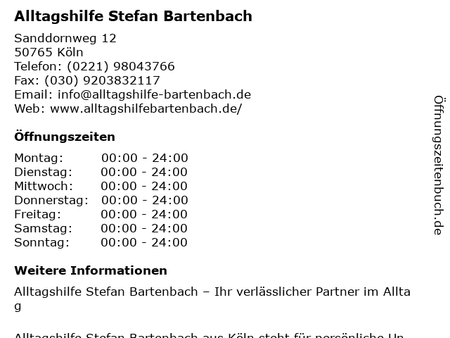 | Öffnungszeiten Alltagshilfe Stefan Bartenbach in Köln anzeigen | |