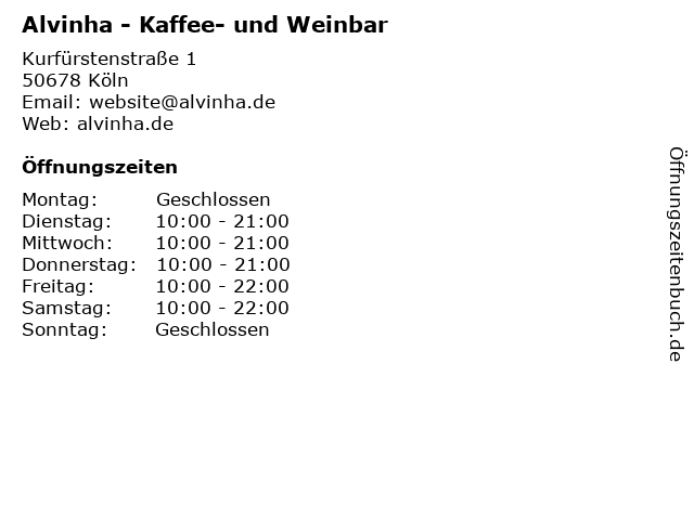 | Öffnungszeiten Alvinha - Kaffee- und Weinbar in Köln anzeigen | |