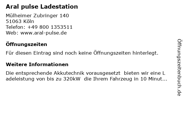 | Öffnungszeiten Aral pulse Ladestation in Köln anzeigen | |