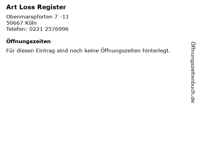 | Öffnungszeiten Art Loss Register in Köln anzeigen | |