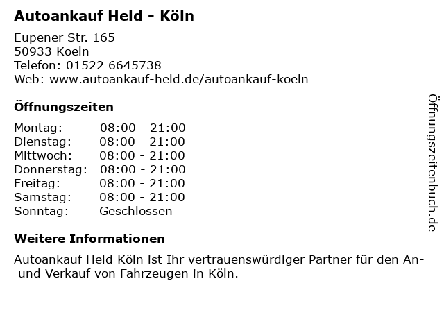 | Öffnungszeiten Autoankauf Held - Köln in Koeln anzeigen | |