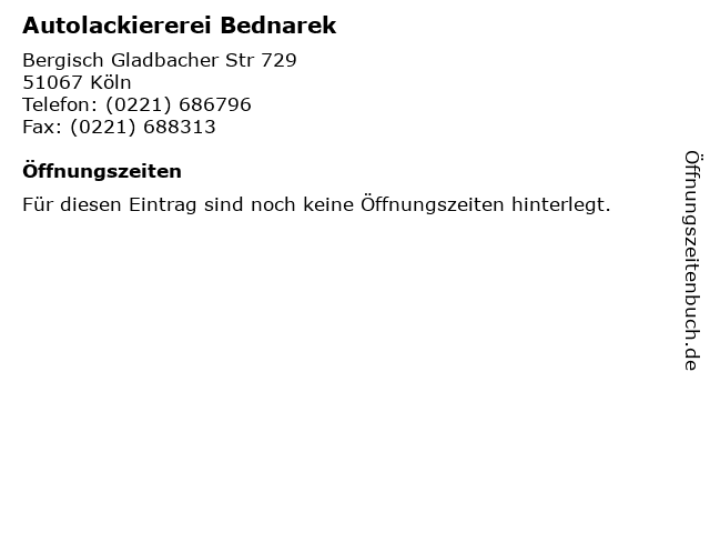 | Öffnungszeiten Autolackiererei Bednarek in Köln anzeigen | |