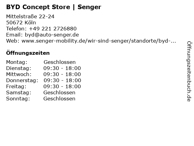 Öffnungszeiten BYD Concept Store | Senger in Köln anzeigen | |