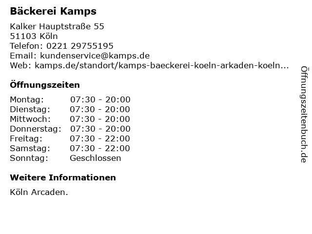 | Öffnungszeiten Bäckerei Kamps in Köln anzeigen | |