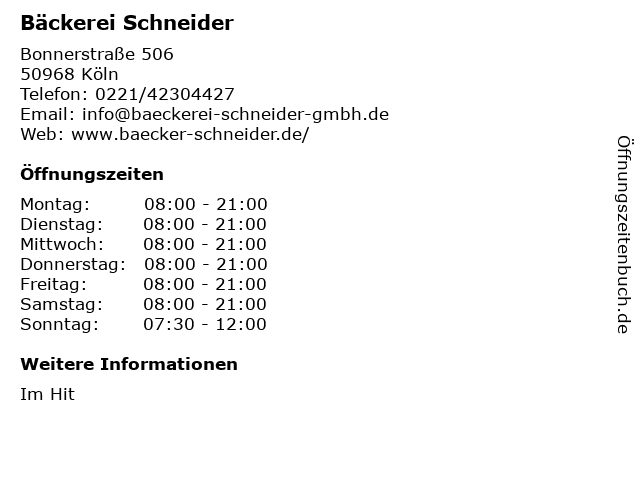 | Öffnungszeiten Bäckerei Schneider in Köln anzeigen | |