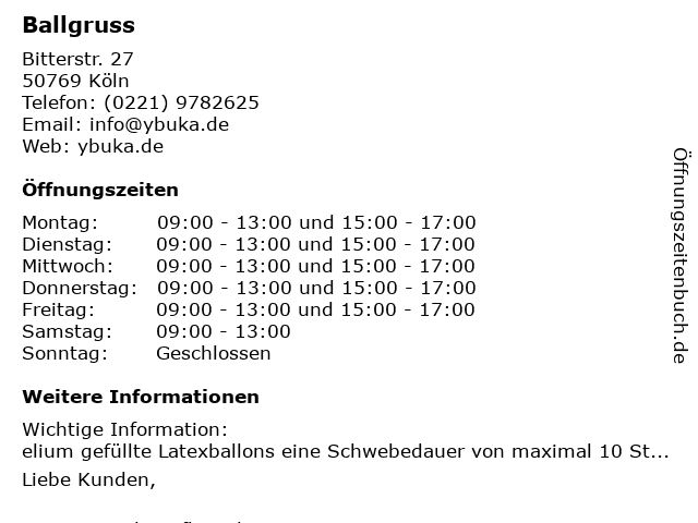 | Öffnungszeiten Ballgruss in Köln anzeigen | |