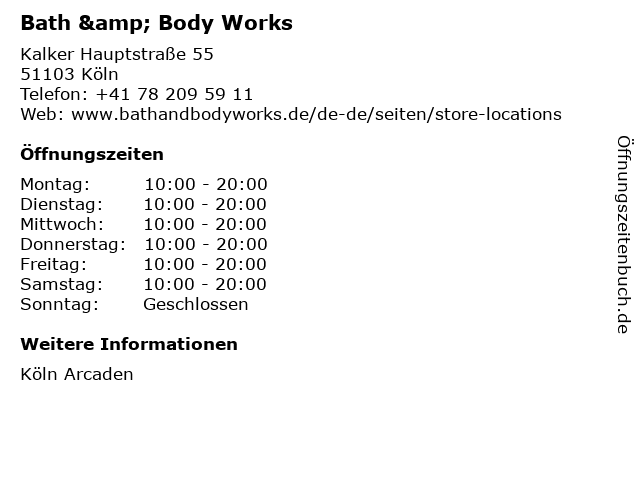 | Öffnungszeiten Bath & Body Works in Köln anzeigen | |
