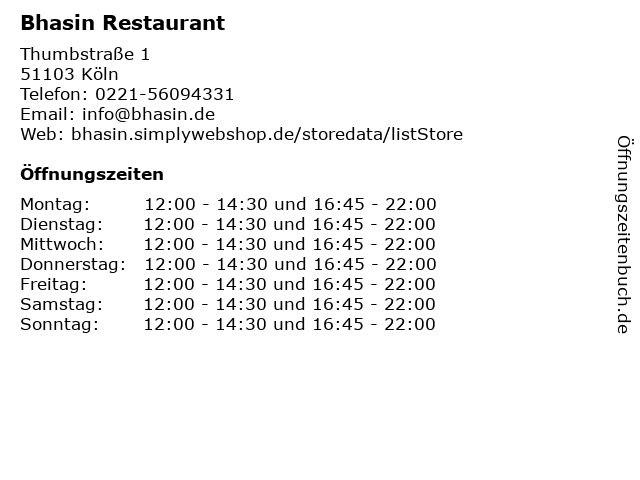 Öffnungszeiten Bhasin Restaurant in Köln anzeigen | |