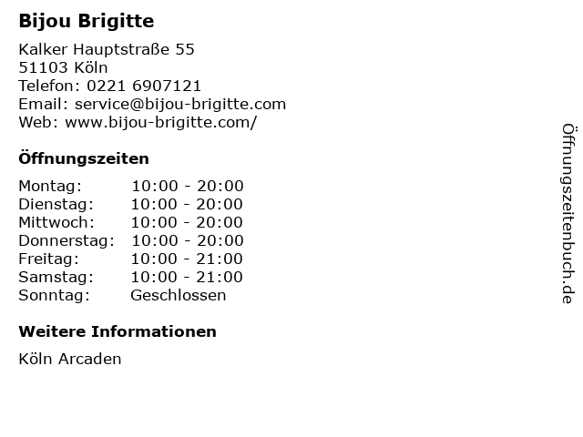| Öffnungszeiten Bijou Brigitte in Köln anzeigen | |