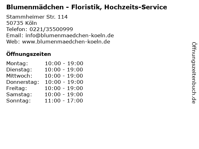 5 Stielecht Floristik | Blumen, Pflanzen und Hochzeitsfloristik Köln (Entfernung: 4,27 km) Landmannstr. 2, 50825 Köln 6 |