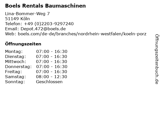 | Öffnungszeiten Boels Rentals Baumaschinen in Köln anzeigen | |