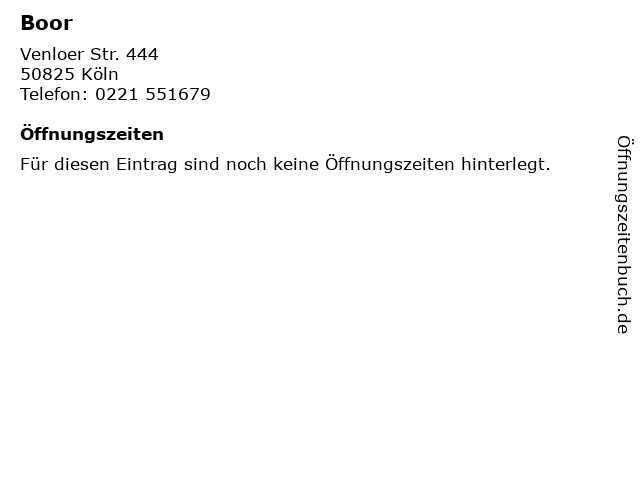 | Öffnungszeiten Boor in Köln anzeigen | |