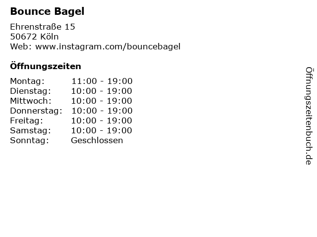 | Öffnungszeiten Bounce Bagel in Köln anzeigen | |