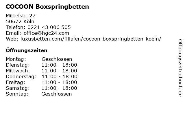 | Öffnungszeiten COCOON Boxspringbetten in Köln anzeigen | |