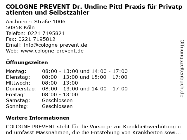 Branchen & Suchbegriffe zu COLOGNE PREVENT Dr. Undine Pittl Praxis für Privatpatienten und Selbstzahler:cologne, dr., innere medizin, pittl, praxis, prevent, privatpatienten, selbstzahler, undine |