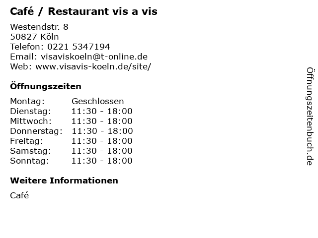 | Öffnungszeiten Café / Restaurant vis a vis in Köln anzeigen | |
