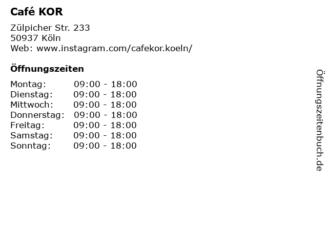 | Öffnungszeiten Café KOR in Köln anzeigen | |