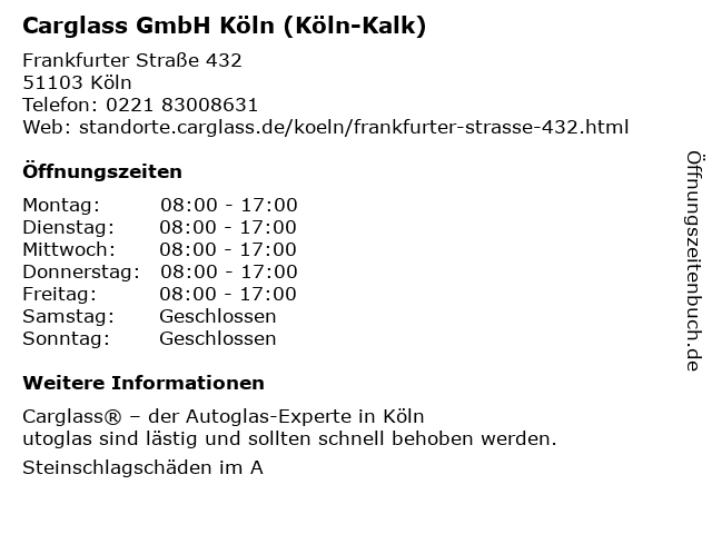 | Öffnungszeiten Carglass GmbH Köln (Köln-Kalk) in Köln anzeigen | |