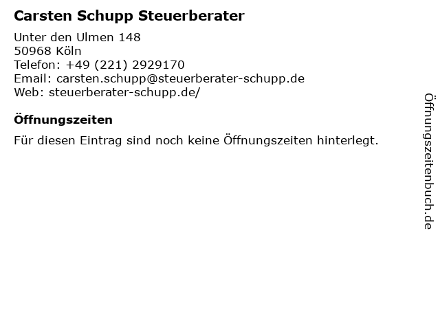 | Öffnungszeiten Carsten Schupp Steuerberater in Köln anzeigen | |