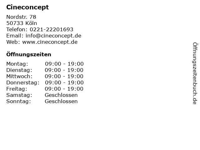 | Öffnungszeiten Cineconcept in Köln anzeigen | |