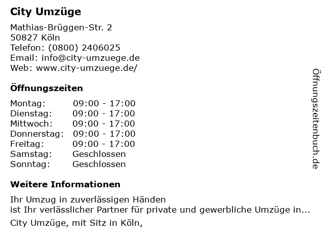 | Öffnungszeiten City Umzüge in Köln anzeigen | |