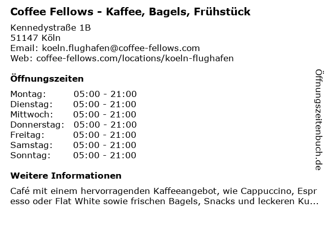 | Öffnungszeiten Coffee Fellows - Kaffee, Bagels, Frühstück in Köln anzeigen | |