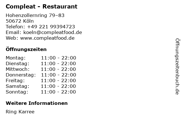 | Öffnungszeiten Compleat - Restaurant in Köln anzeigen | |