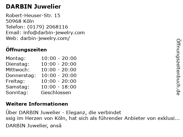 | Öffnungszeiten DARBIN Juwelier in Köln anzeigen | |
