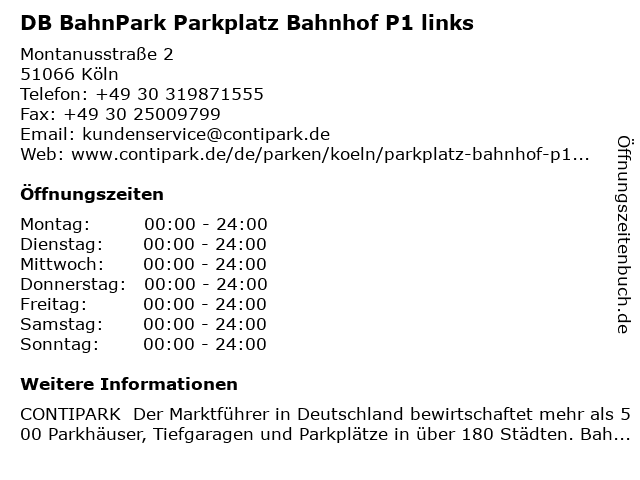 1 DB BahnPark Parkplatz Bahnhof Köln-Mülheim P2 rechts (Entfernung: 0,09 km) Montanusstraße , 51065 Köln 6 |