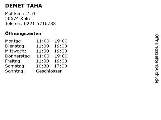 | Öffnungszeiten DEMET TAHA in Köln anzeigen | |
