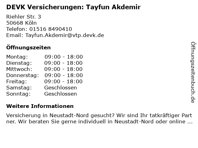 2 DEVK Versicherung: Marwa Saleh (Berater*in ausgeschieden) (Entfernung: 0,00 km) Riehler Str. 3, 50668 Köln 6 |