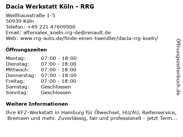 | Öffnungszeiten Dacia Werkstatt Köln - RRG in Köln anzeigen | |