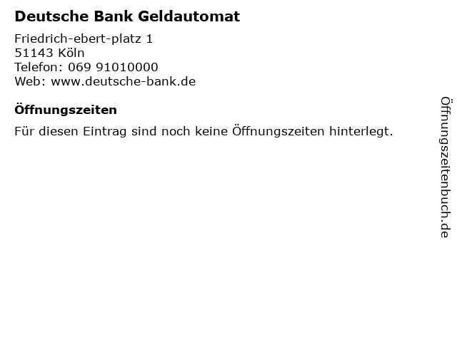 | Öffnungszeiten Deutsche Bank Geldautomat in Köln anzeigen | |