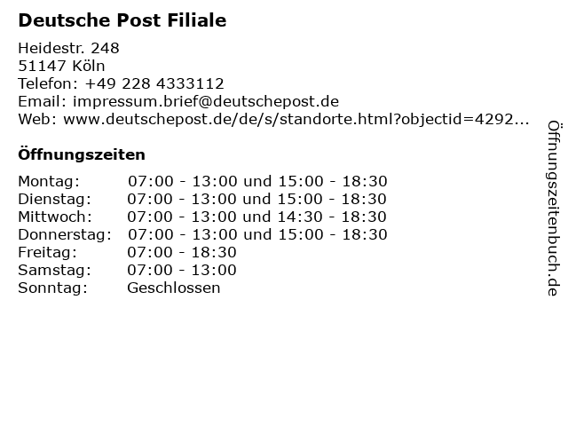 Öffnungszeiten Deutsche Post Filiale in Köln anzeigen