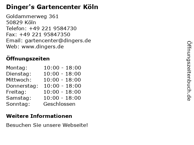 | Öffnungszeiten Dinger's Gartencenter Köln in Köln anzeigen | |