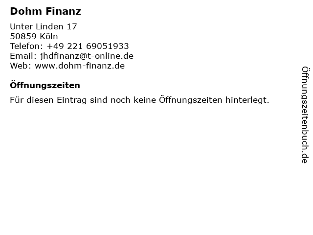 | Öffnungszeiten Dohm Finanz in Köln anzeigen | |