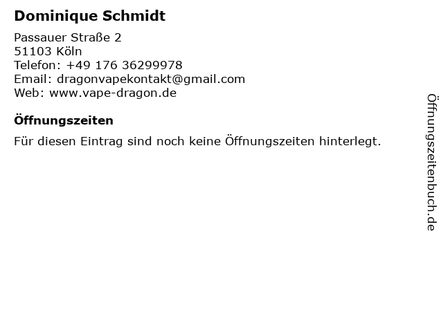 | Öffnungszeiten Dominique Schmidt in Köln anzeigen | |