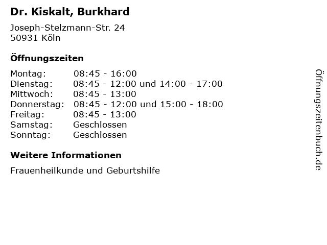 | Öffnungszeiten Dr. Kiskalt, Burkhard in Köln anzeigen | |