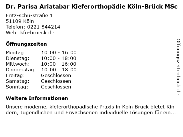 Branchen & Suchbegriffe zu Dr. Parisa Ariatabar Kieferorthopädie Köln-Brück MSc:ariatabar, dr., kieferorthopädie, msc, parisa |