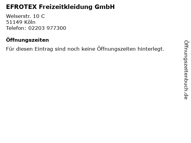 | Öffnungszeiten EFROTEX Freizeitkleidung GmbH in Köln anzeigen | |