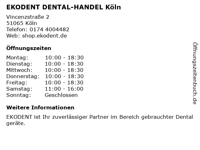| Öffnungszeiten EKODENT DENTAL-HANDEL Köln in Köln anzeigen | |