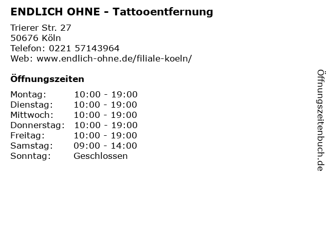 | Öffnungszeiten ENDLICH OHNE - Tattooentfernung in Köln anzeigen | |