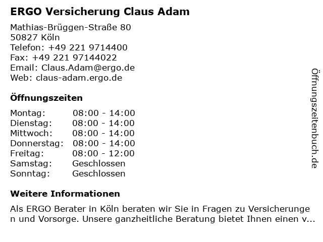 | Öffnungszeiten ERGO Versicherung Claus Adam in Köln anzeigen | |