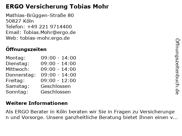 | Öffnungszeiten ERGO Versicherung Tobias Mohr in Köln anzeigen | |