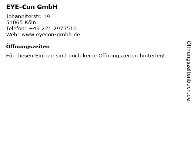 | Öffnungszeiten EYE-Con GmbH in Köln anzeigen | |