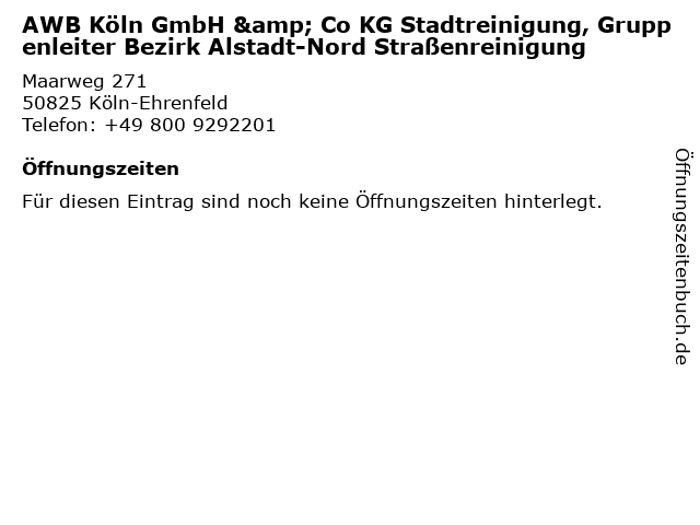 | AWB Köln GmbH & Co KG Stadtreinigung, Gruppenleiter Bezirk Alstadt-Nord Straßenreinigung anrufen | |