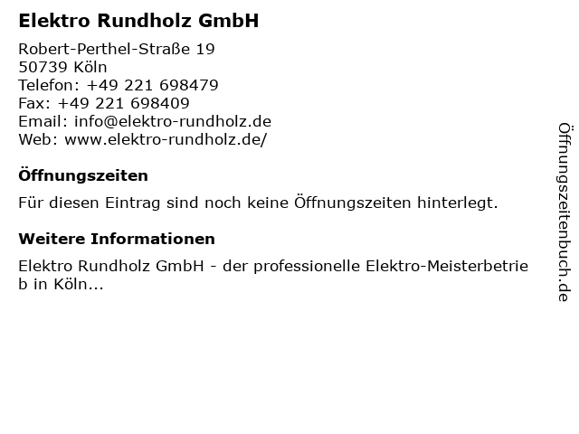 | Öffnungszeiten Elektro Rundholz GmbH in Köln anzeigen | |