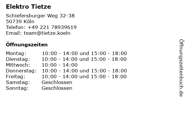 | Öffnungszeiten Elektro Tietze in Köln anzeigen | |