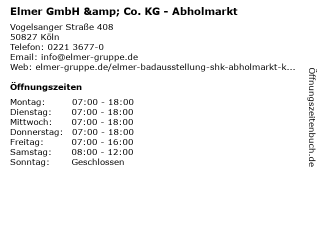 | Öffnungszeiten Elmer GmbH & Co. KG - Abholmarkt in Köln anzeigen | |